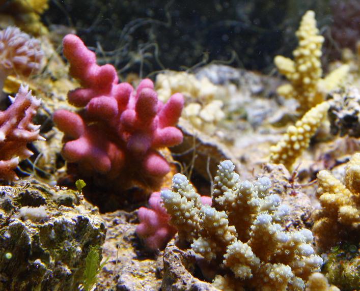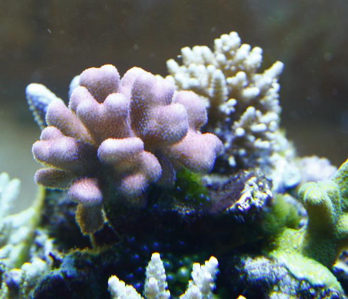 Вставлю свои пять копеек. Происхождение коралла тоже (фраг Стаса) фото не очень, октябрь прошлого года( то что в компе на работе нашел).Сейчас минимум в три раза больше а цвет темно насыщенный розовый.Освещение т5.