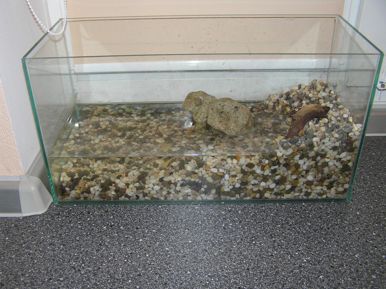 Подложка (субстрат): для акватеррариума - гравий, для аквариума - крупная галька, плоские камни и коряги.