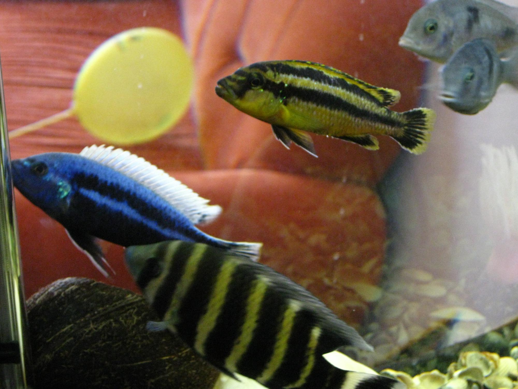 1.Pseudotropheus zebra Зебра белая 10 см. - 1 шт. (фото 1 и 2) отдам за бутылку артемовского шампанского или эквивалент.(уже забрали) 2.Меланохромис Чипока пара (самец синий 12см, а самочка желтая 10см. на фото 3) - 70 грн. за уже дружную пару