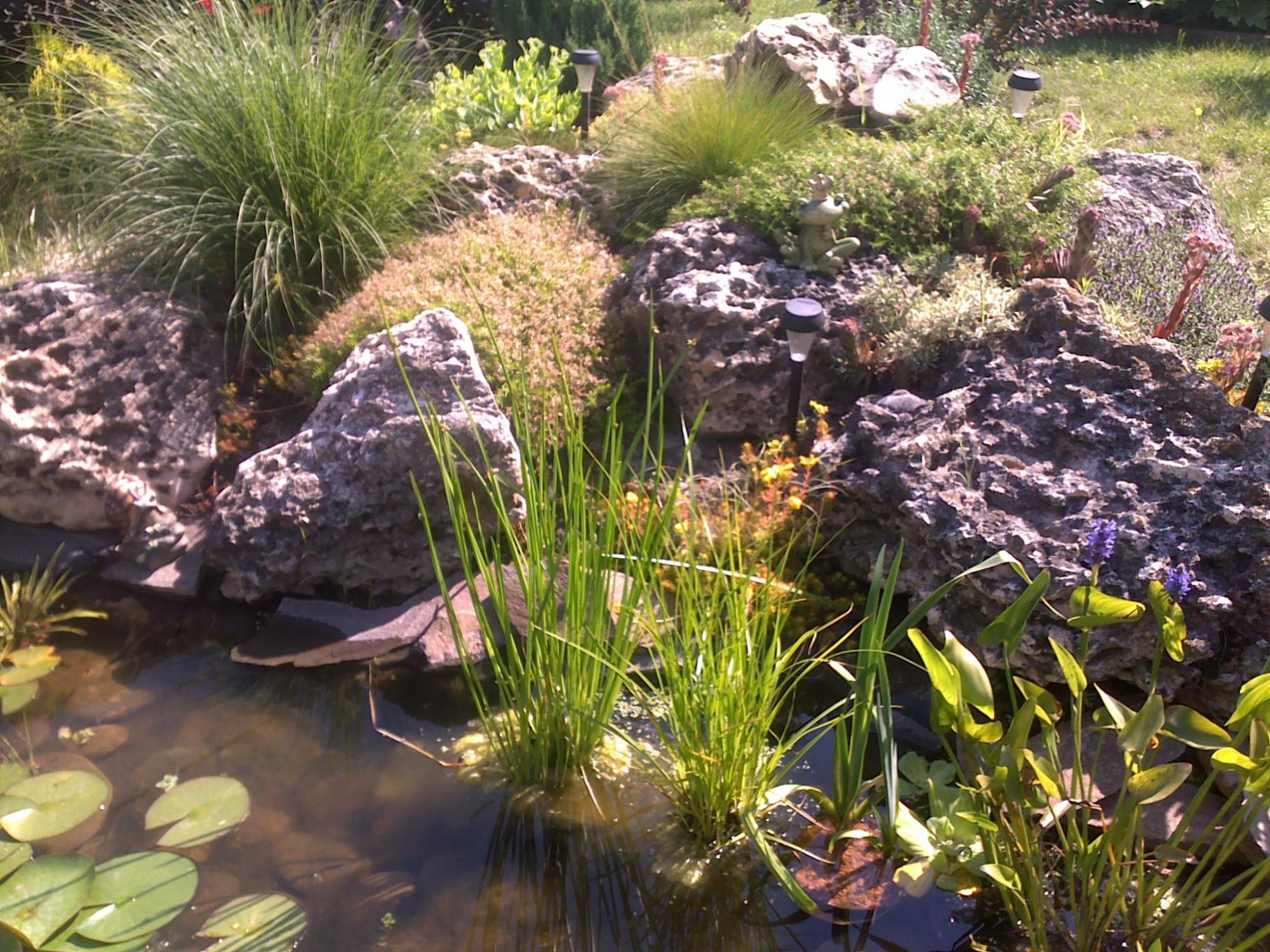 Вот прошло 2 года . Горка с прудиком сейчас выглядит так. До сих пор там не существует ни одного фильтра и аэрации. Правда рыб нет. Этой зимой там сохранились нимфеи, хотя глубина над грунтом нимфей была не более 50см. Я даже ящики с нимфеями не опускаю, и не поднимаю. Вода все время прозрачная. Ранней весной была нитчатка. Несколько раз собирала руками, а потом она сама по себе была вытеснена растениями.