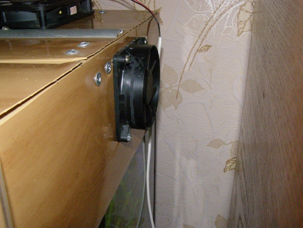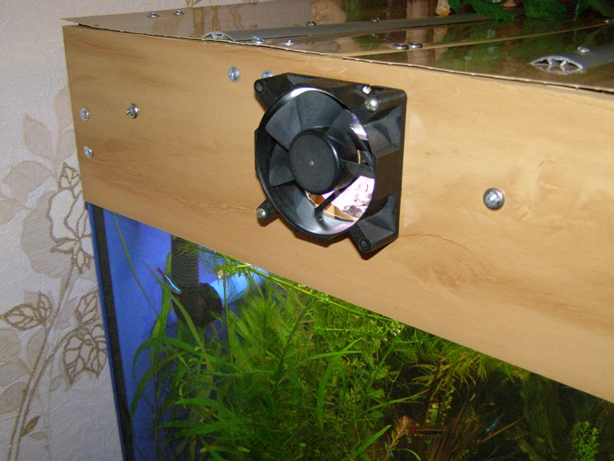 Вчера внес изменения в конструкцию крышки - поставил вентеляторы с боков, один на вдув, один на выдув - 80мм, компьютерные, 12 вольтовые, подключил на 10 вольт, обороты приличные, но не слышно , включаются с включением освещения. Увеличил световой день на 1,5часа. Убрал покровные стекла и крышку оставил на день закрытую - вроде получилось неплохо, днем в квартире 28, вечером в аквариуме 28,5, и как ни странно - влажность в квартире - 70%. Посмотрю, как будет дальше.