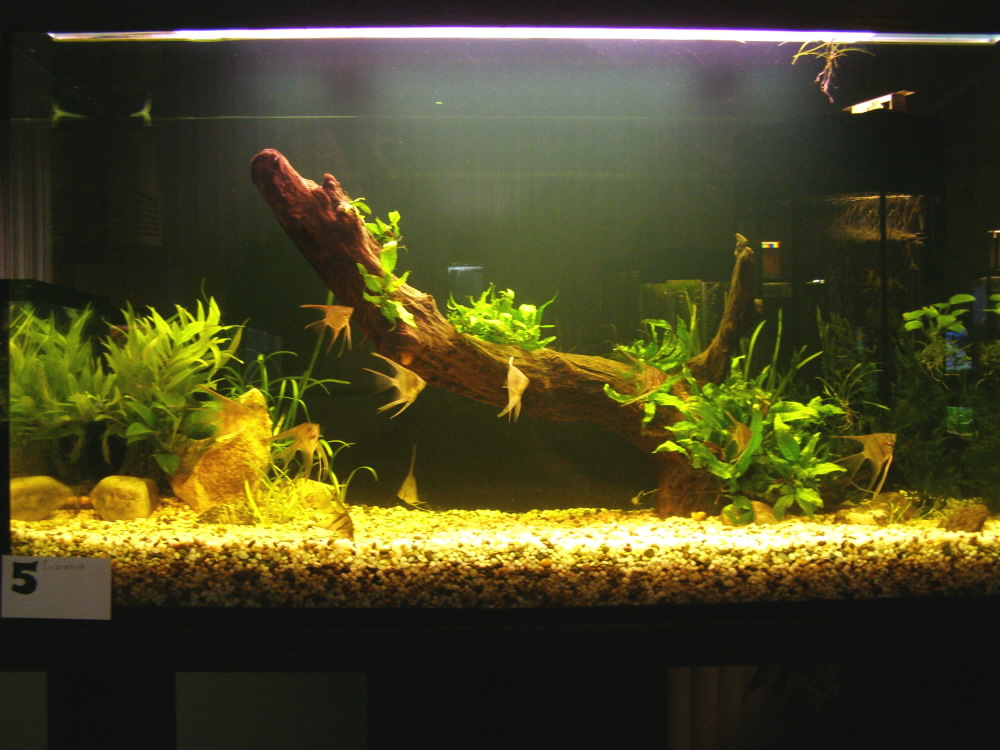 По поводу выставочной (не конкурсной) экспозиции. Хотя я и не понимаю прелестей аквариумной формы "колонна", но, тем не менее, один аквариум запал в душу – это аквариум с длинной, тонкой извивистой корягой, элегантно обкрученной ярко оранжевой лианой, хоть и искусственной (искусственные растения, как правило, не воспринимаю) но в совокупности с желтым спектром подсвечивающей лампы выглядящей очень живописно. Гармонично дополняет картину стайка телесного цвета скалярий. В общем, получилось весьма гармонично. В буддистском стиле. Было еще несколько интересных на мой взгляд "колонн", например с тетродончиками. Из других, весьма понравился аквариум с пираньями.