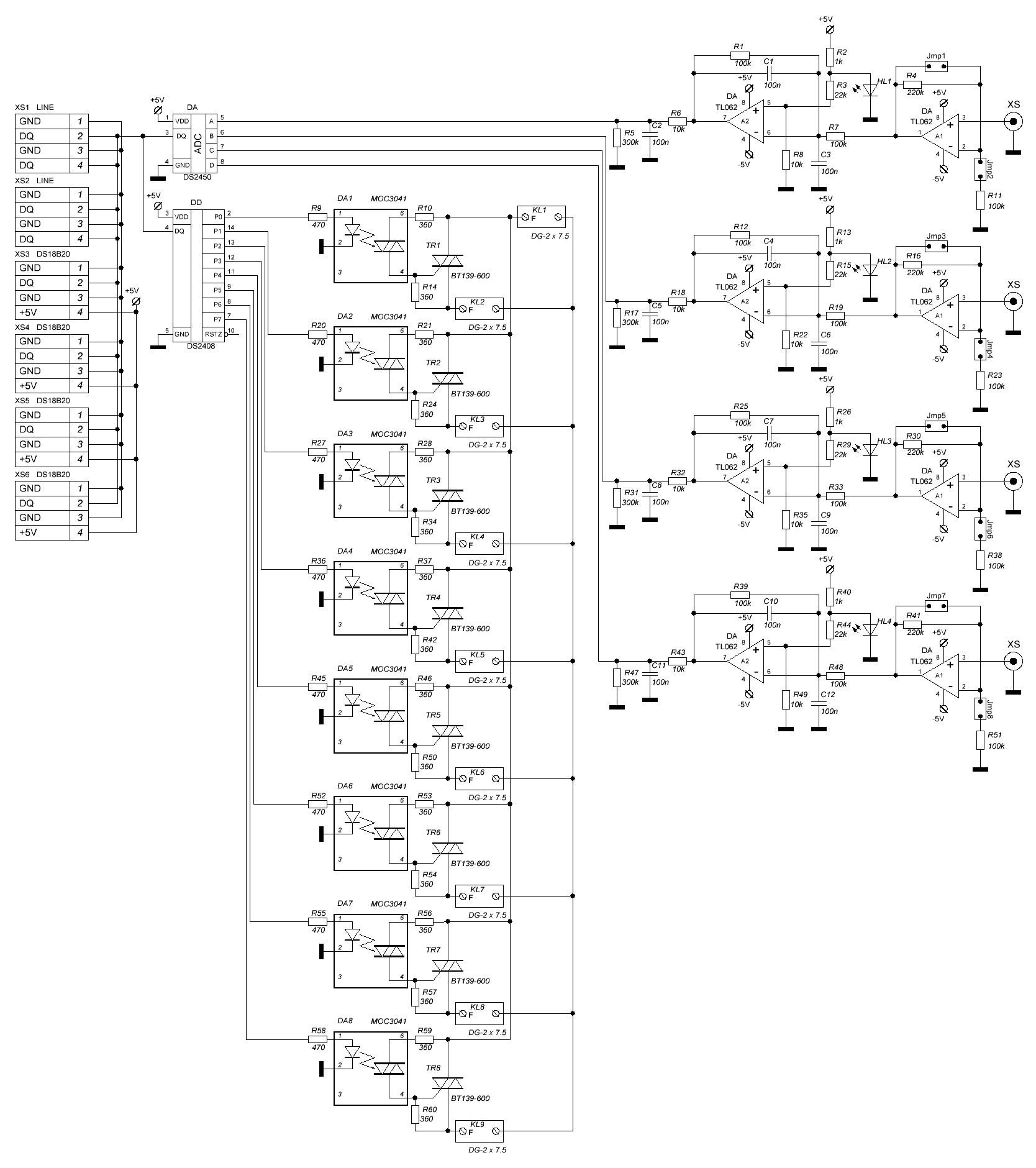 Согласно даташиту на DS2408, суммарный входной ток через выводы P0..P7, RSTZ, I/O не должен превышать 20 mA, а у нас получается до 64 mA (около 8 mA через каждый из выводов P0..P7). Для уменьшения суммарного входного тока можно поступить таким образом: - сопротивление резисторов увеличить с 470 Ом до 1 кОм, что уменьшит входной ток каждого вывода Pn до 4 mA. Соответственно, вместо оптронов MOC3041 надо взять оптроны MOC3043;