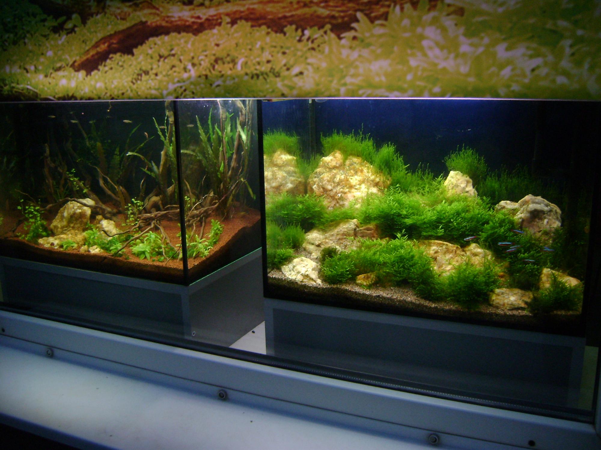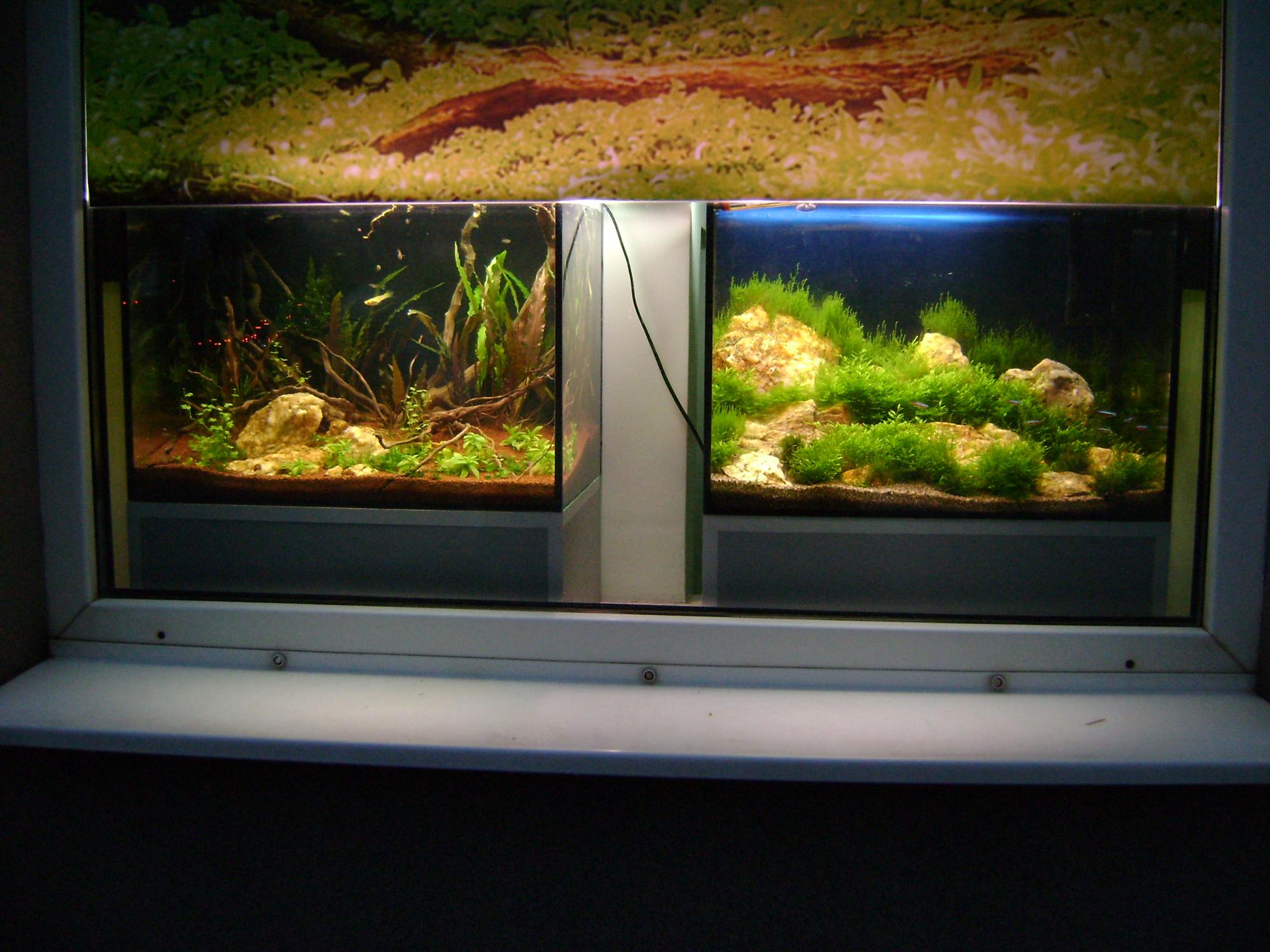 Вот фото аквариумов,которые работают в ночное время в качестве ракламы)))Аквы стоят на подоконнике и в ключаються только в темное время суток,днем закрываются завесом от света.Обычные аквариумы без добавления УДО,СО2.Свет 1х30 вт Гролюкс,1х30 вт Скайлайт.