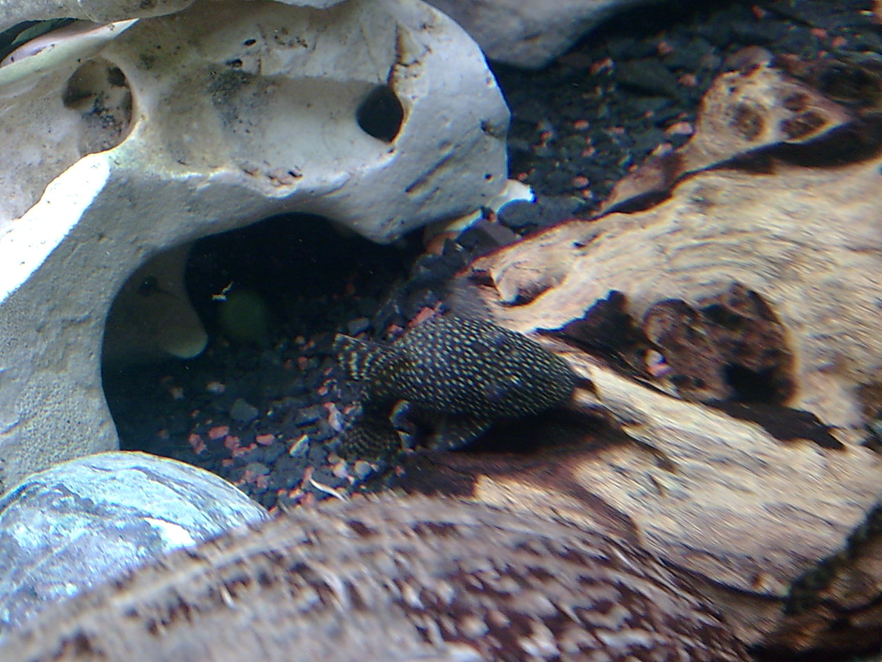 Вот фото проблемных рыб. Поведение красной цихлиды: забивается в укромное место и сидит( причина - её гоняют две других красных цихлид (пара)) Самка- сомиха ведёт вроде нормально - то сидит на стенка , то куушает , чистит стенки , камни, коряжку , но меня волнует её животик. Самец-сом , расцветка беспокоит (белые пятна) случайно не бактериалка? всё время сидит под камнем. за целый день я раз видел как он пару мин плавал .