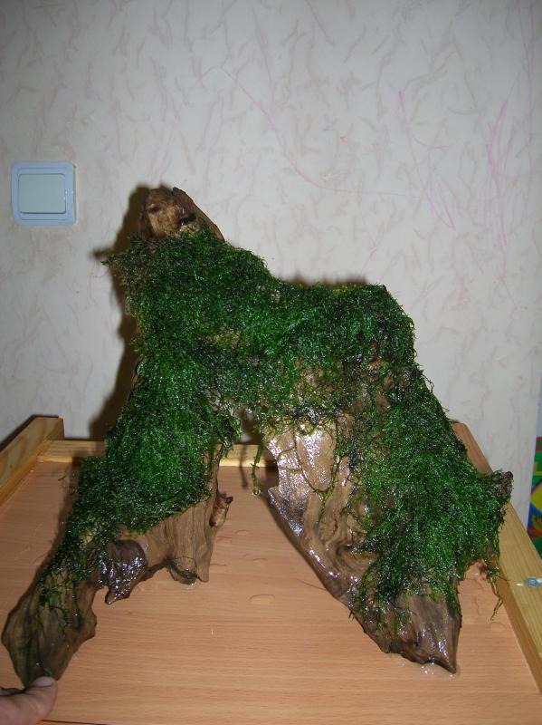 Несколько раз пытался прирастить яванский мох к коряге,но безуспешно.Он все время стремился расти в толщу воды и упорно не хотел цепляться за корягу.вид был как будто ветки мха просто плавая зацепились за корягу,но не росли на ней.Решение оказалось достаточно простое : к коряге приматываем нитками мох как нам нравится,кладем в пакет,наливаем немного воды ,завязываем и ставим в светлое место.В импровизированном полюдариуме мох растет гораздо быстрее,всеми силами цепляясь за корягу.Через неделю беспощадно стрижем все молодые побеги светло зеленого цвета,чем чаще (в разумных пределах) стрижем ,те кустистее получается "газон".Как только вид коряги будет нас устраивать переносим в аквариум,не забывая промывать её при чистке (мусора собирает много) и регулярно подстригать.Переход с суши в воду мох переносит прекрасно,лишь немного насыщеней становится зеленый цвет.