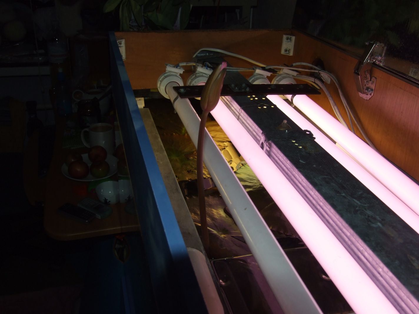 Проблема с нимфеями. До того как были установлены лампы дневного света стоял прожектор с галогенной лампой. Стекла покрывались зеленью ну просто ОЧЕНЬ БЫСТРО. Хотя аква смотрелась при этом свете просто обалденно. Но смотрелось это одно, а то что хреновенько растениям было - это совершенно другое. Нимфеи просто положили листья на грунт. Новые они кидали, но все ложились на грунт.