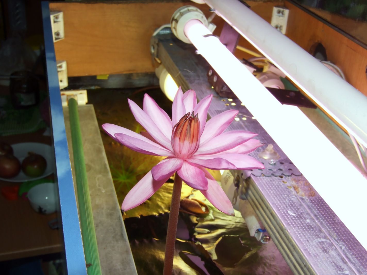 Убрал прожектор и повесл 2 лампы. Нимфеи листы подняли, но на высоту около 7-8 сантиметров. Выше не идут. Хотя пестрая и красная кинули уже по отводку.
