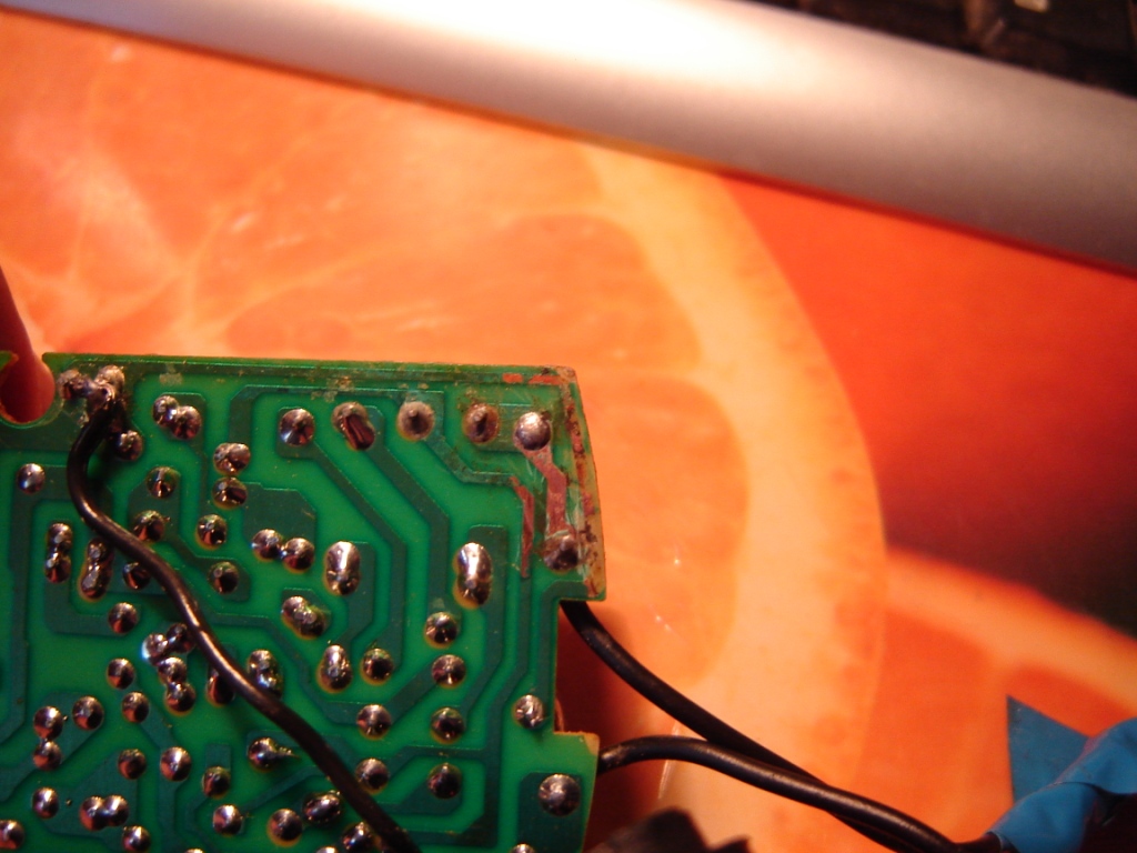 После попадания воды, видимо вследствие подтекания корпуса УФ стерилизатора и далее по проводу питания в адаптер, перестала светить лампа. Разобрав блок питания увидел представленное на фотографиях. Визуально все цело, кроме резистора и дорожки на плате, перемычка на дорожке эффекта не произвела.Светодиод на корпусе горит.