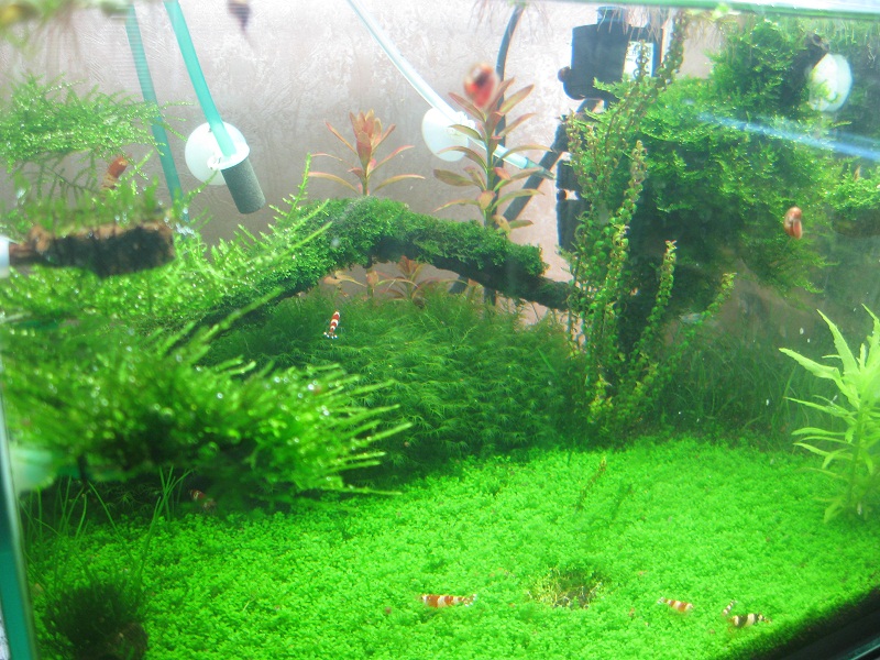 На сегодня аквариум почти зарос, подселил недавно пьяток желтых креветок, одна самка сегодня набрала икру, буду ждать пополнения, фото аквариума на сегодня: