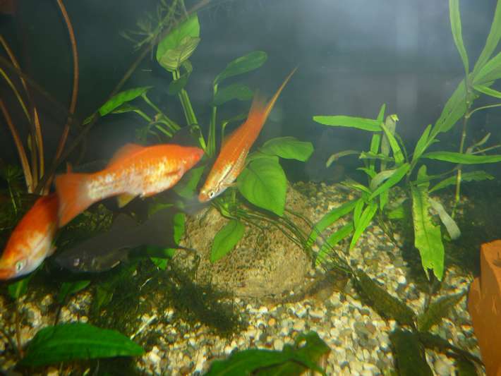 от этой линии мечей 6 месяцев назад, получился один интересный малек, который вырос в такую прикольную самку (на фото девушка посередке), самка получилась с более выраженым красным цветом, красный глаз и кроме этого по середине туловища выделяются отдельные чешуйки, как у зеркального карпа, чешуйки имеют синеватый отлив (жаль на фото не видно всей красоты, фотограф с меня хреновый  ). Может получится закрепить данную линию.