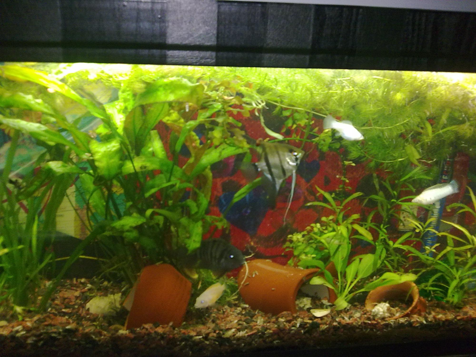 Заклейте заднюю стенку специальным фоном для аквариумов в синем цвете, и увидите, как все преобразится.