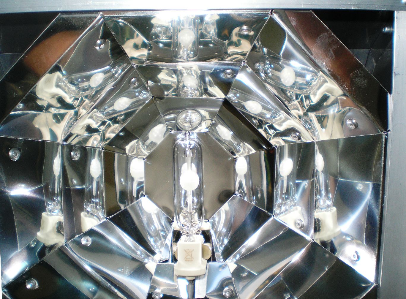 Отражатель сделал из зеркальной алюминиевой потолочной панели. Размеры панели 60х60 см, толщина 0,4 мм. Корпус светильника из такой же панели белого цвета. Лист кроил обычным канцелярским ножом по чертежу. Выкройка отражателя слизана с лекала Lumenbrite III, и масштабировано под желаемый размер. Собраны рефлектор и корпус на алюминиевых заклепках. Разборные крепления на винтах/гайках. Технологию изготовления отражателя украл отсюда: http://www.aqualogo.ru/phpbb2/index.php?showtopic=18881
