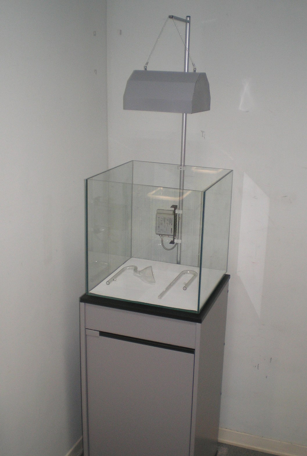Вот почти доделал тумбу (осталось внутреннюю начинку домонтировать) и установил светильник. Крепление - алюминевая труба, закрепленная на пластиковых клипсах к тумбе. Легко регулируется высота подвеса светильника перемещением трубы по вертикали. Максимальная высота получается около 45 см от лампы до верха банки. Также можно поворотом трубы перемещать светильник влево или вправо для удобства обслуживания банки.