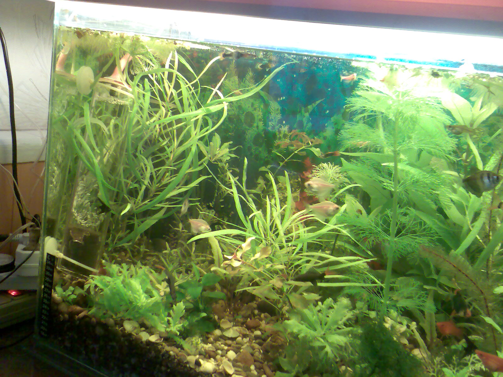 Дорогие форумчане, прошу ваших комментариев на мой аквас в 120 литров, аквариум изготовил сам -стекло, самодельная крышка из обрезков пластика , светоотражатель- проклееная фольга - освещение 2*24 вт +2*18вт, фильтр ФАН-2 , подача СО2 в колокол, аэрация, температура 26-28, более 20 видов растений(названия всех не знаю), грунт-крупнозернистый песок (толщина 5-6 см), затем мелкая черноморская галька (толщина 3-5 см). рыбы- тернеции, барбусы, лабео, меченосцы, молли, скалярии, сомы.рыбы живут в гармонии без особых конфликтов. еженедельная подмена воды 1/3. Аквариум изготовлен для моего рабочего кабинета.