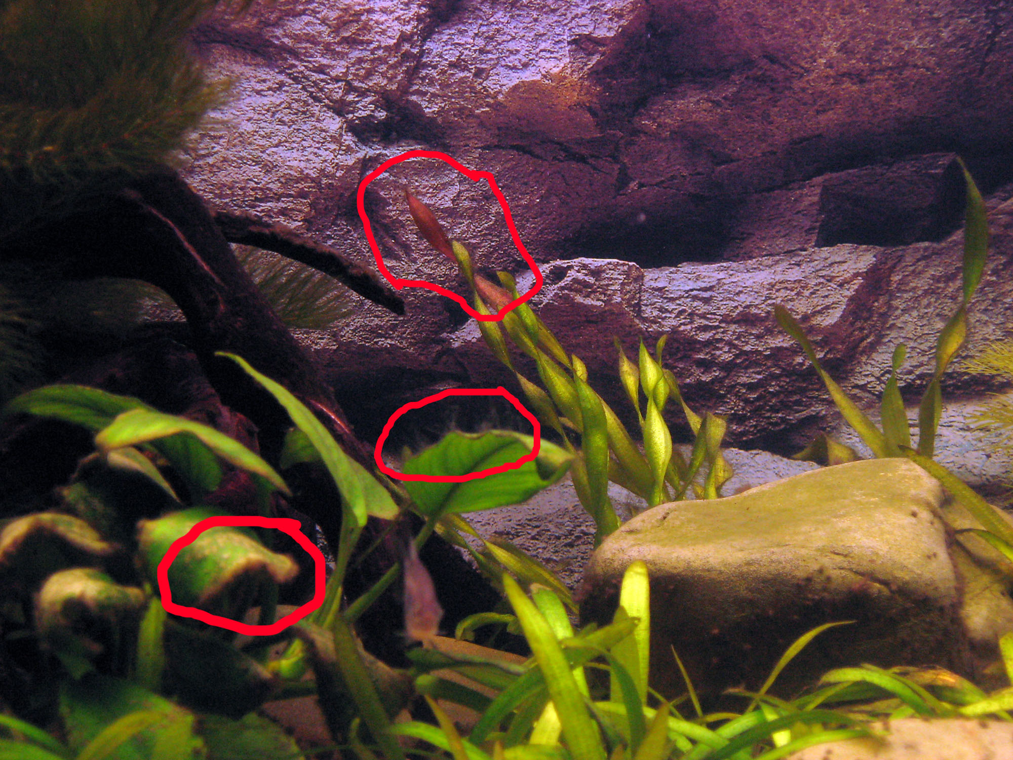 Решил задуматься. Две недели тому назад началась «охота» на меланию: за первую неделю выбрал более 500-600 особей (охота не прекращается и по сегодня). Тогда же произвел обильную сифонку грунта (гавна было немеренно). 2 недели тому назад также начал менять воду каждый день по 10 литров (водопроводная вода) и вливать удобрения Флорастим FE (2мл) Флорастим (2мл) (исходя из инструкции). В период массовой популяции меланий появилась борода (она и стала первопричиной очистки аквариума от органики). Неделю назад запустил бражку. Итак, вроде есть все условия для нормального роста растений (свет, СО2, удобрения, подмена воды). Некоторым растениям (людвигия, анубиас, амбулия, ротала) новые условия сильно понравились, и они начали бурный рост. Но, например, на валлиснерии и анубиасе начался бурный рост нитчатки (фото 3, там же видно кальциевый осадок на листке анубиаса ). На кончиках растения уже «минигубка», а некоторые стебельки валиснери на концах стали бурыми и отмирают, хотя каждый вечер растения обильно «бульбуляют».
