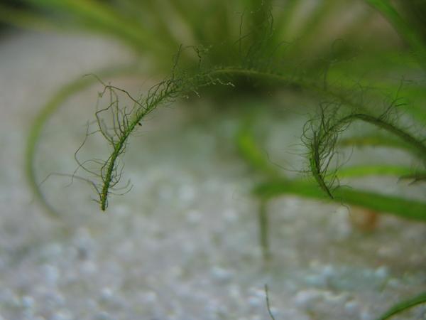 У меня такие водоросли были в нерестовике, баланс наладился, но на кончиках старые водоросли остались болтаться, вручную оборвала.