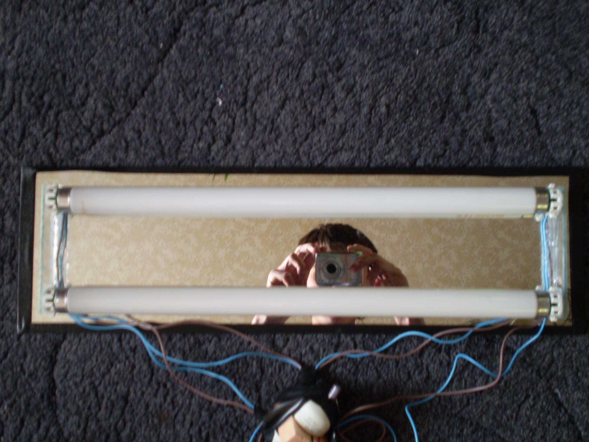 К зеркалу,на ширину 15 ватных люм ламп т8 были приклеены два кусочка стекла на которые были силиконом приклеены по два патрона.Таким образом мы получили крышку-светильник на две лампы.Лампы подключил от микросхем которые извлек из енергосберегалок-которые раньше использовал для освещения аквы(15 вт).Микросхеми были вложены в патрон от этих же енергосберегалок разделены между собой кусочком пенополистерола и смотаны изолентой, подключал на одну вилку сразу две лампы.Микросхемы вынес за пределы аквы.Зеркальный потолок с лампами просто кладем на акву сверху и ВУАЛЯ!!!Все готово.Нового конечно же ничего нет, но все же кому-то будет интересно посмотреть, кто то для себя чего-нибудь да вытянет полезного и всего описаного.А так-красиво, надежно, а самое главное совсем не сложно и практически из подножных средств))))Если что не понятно спрашивайте буду рад помочь!