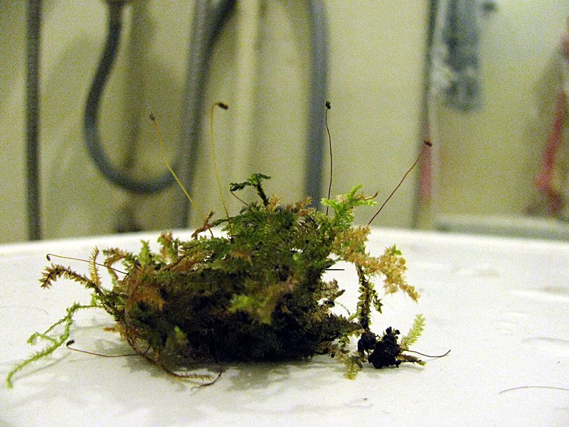 Неопределенный мох местный, Одесский, в дикой природе кочки около 1см из пресованной пыли, сам же мох не выше 1-2мм. В террариуме таки да прижился, но поредел и вытянулся, особого роста не наблюдается, но и не умирает. Вытянулся на 2-5мм стал тёмно зеленым.