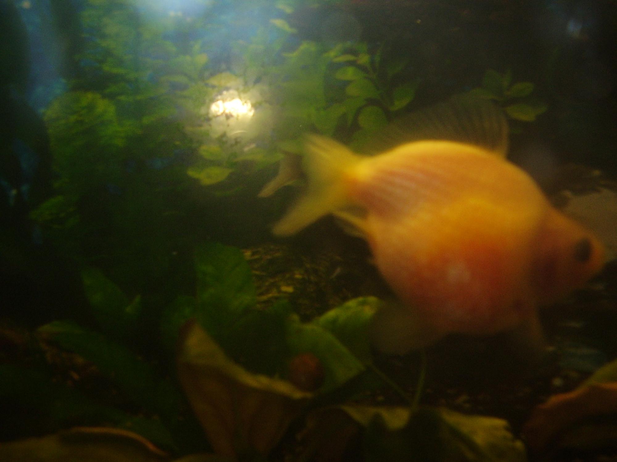 Вот прошло время, было всё нормально, а теперь опять вылезло то же самое, только с другого бока. Аппетит остался у неё нормальный. Хотя пока небыло каких-либо внешних признаков, она всё равно висела вниз головой. Не болеет больше ни один житель аквариума, хотя есть более слабые рыбы (телескопы, водяные глазки). Это фото лучше всех отображает её постоянное состояние. Только в этот раз ранка ещё не стала пока такой большой, но чешуя уже оттопырилась...