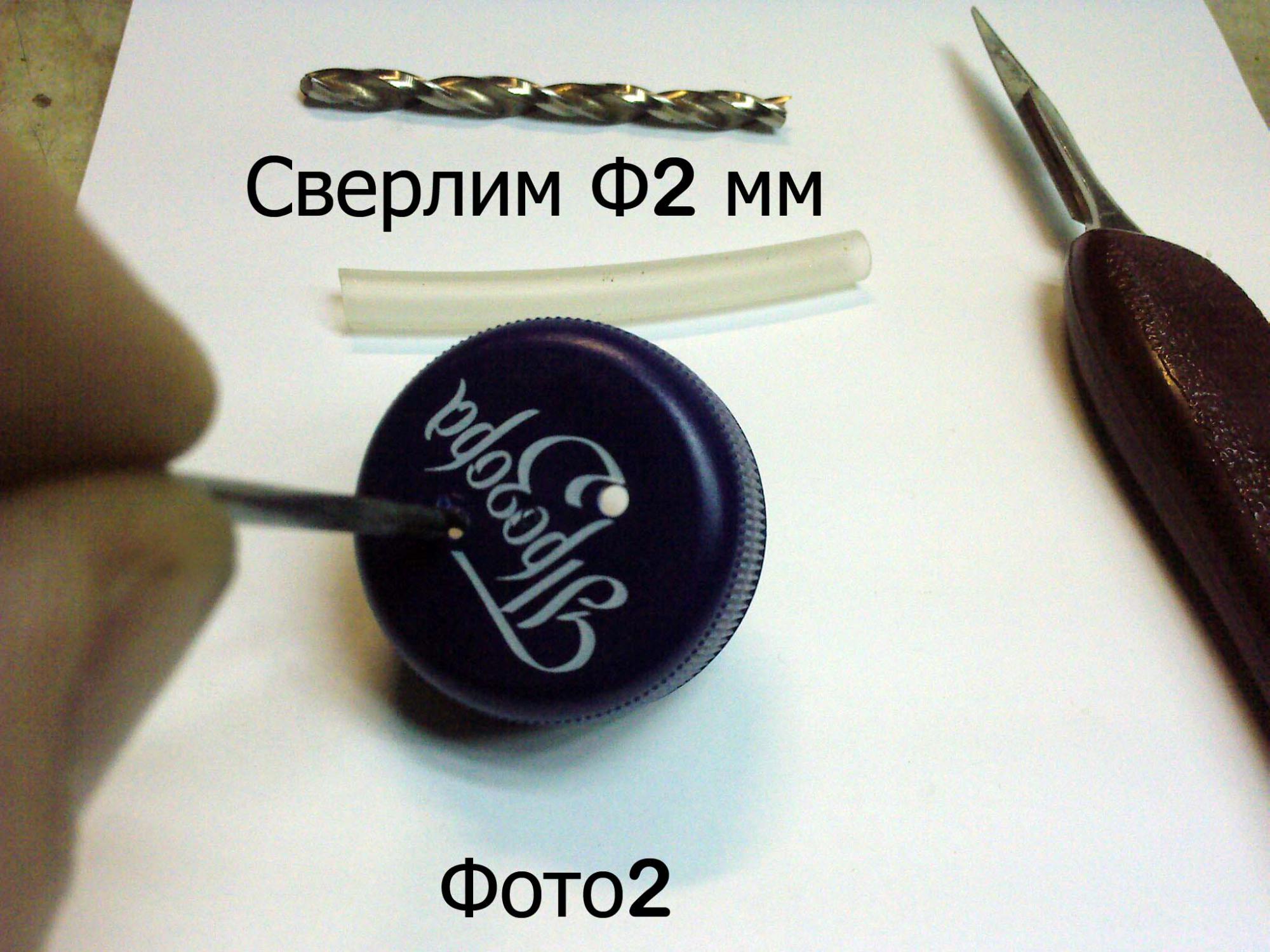 Р.S.-По рекомендациям Господина BelkinS-а можно сделать так: в крышечке от бутылки высверлить два отверстия диаметром 6мм (нужно сверлить острым сверлом и аккуратно, чтобы отверстие было с ровными краями), в них вставить шланги тоже диаметром 6мм (толстостенные компрессорные), так чтобы с внутренней стороны крышки они выходили примерно на 5 мм. И изнутри в шланги вставил белые штуцеры от капельницы. Они входят в шланги с усилием и за счет расширения шланга в этом месте, намертво загерметизировали соединение. Дополнительно ничего не проклеивал.