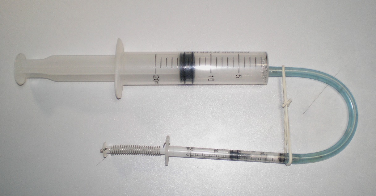 А вот еще такая конструкция из 20-мл шприца: вместо пружины герметичная заглушенная часть шприца (левая на фото). Отверстие аварийного сброса между двумя поршнями, не очень его видно. Работает и как манометр и как аварийный клапан. Сейчас проверил, много лучше пружины. Давление аварийного сброса можно менять, изменяя давление в заглушенной части шприца (даже регулировочный винт можно поставить). Из минусов - небольшая температурная зависимость давления (все те же газовые законы).