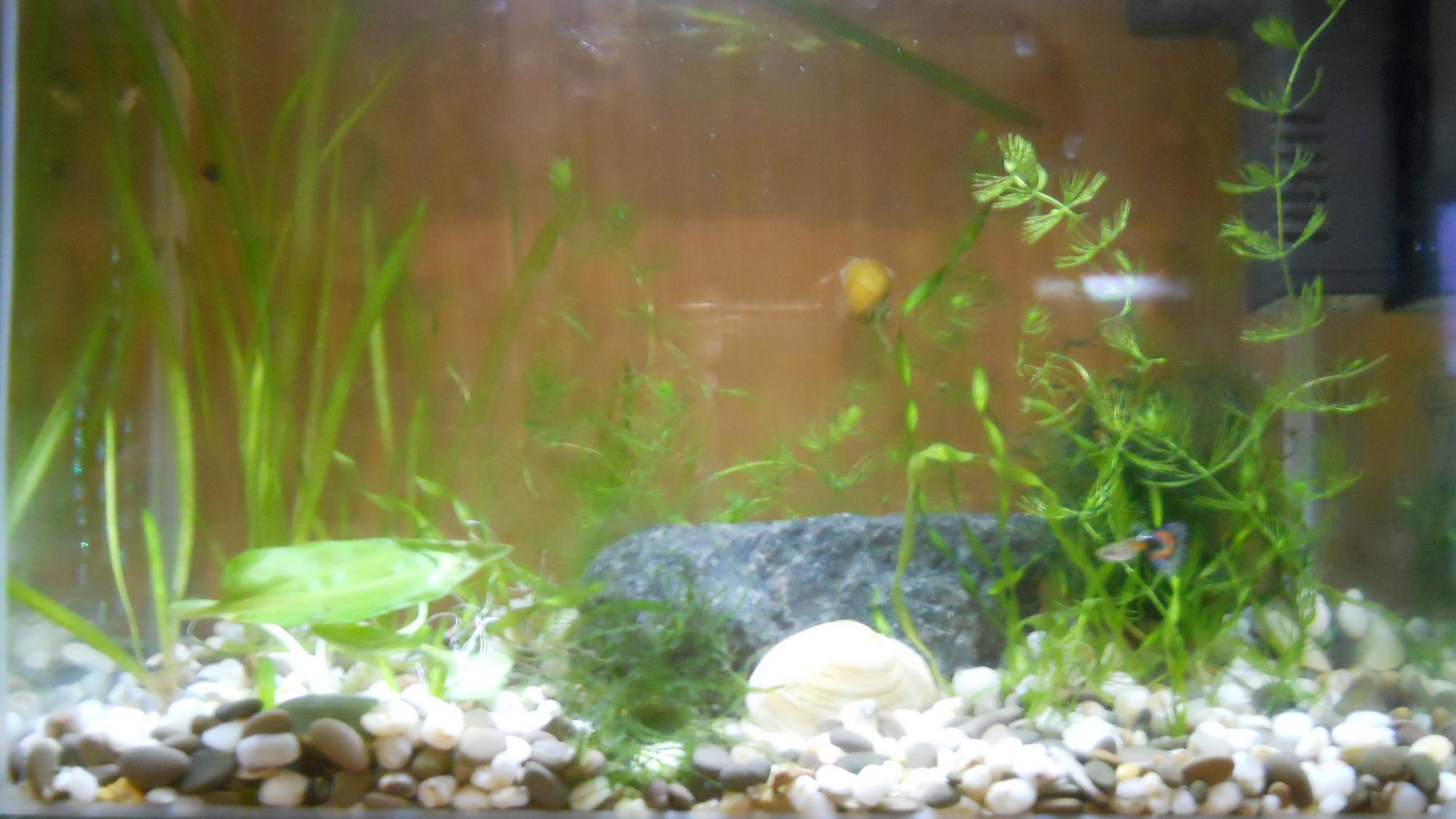 4 суматранца и 4 гуппи(2пары - самец + самка), ампуляшка и катушки.