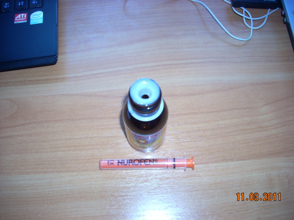 Хотел бы поделиться опытом дозировки УДО. Удобным, на мой взгляд.У кого есть маленькие дети, те знают препарат Нурофен для детей и его удобный набор шприцем. В горлышко бутылки вставлена дополнительная пробочка с отверстием под диаметр шприца (фото), шприц плотно вставляется в это отверстие (фото),потом бутылка переворачивается и идет набор жидкости (фото).Шприц без иглы и достаточно удобный, протечек при наборе жидкости -нет!