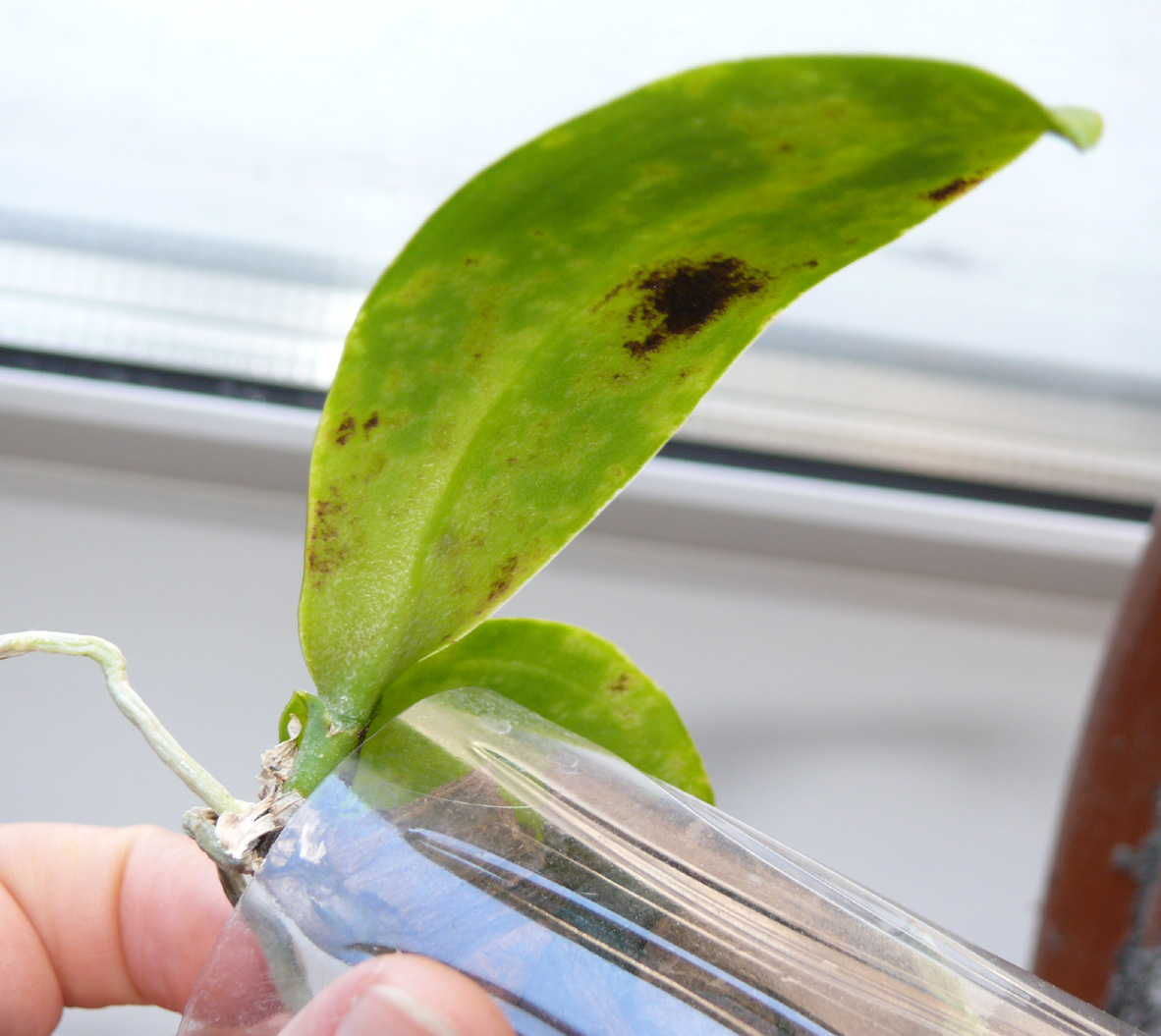 Дали мне детку фалинопсиса 3 мес. назад. Вид у нее был получше, чем сейчас, тем не менее, она зацвела (вытянула только 2 цветка). Цветонос я обрезала, что бы не истощать растение. Корни в порядке. Сейчас сидит в таком состоянии как на фото уже месяц.