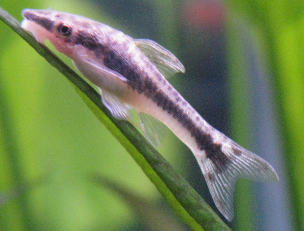 3. У второго отоцинклюса (новая рыба) раздут живот. Не очень сильно, но заметно. Хотя он активен и ест со стенок и растений. Возможно окраска стала немного бледнее. Но тут уверенности нет. Явных пятен нет. На фотке видно, что из брюшка как будто вылезла кишка. Это совсем недавно появилось.