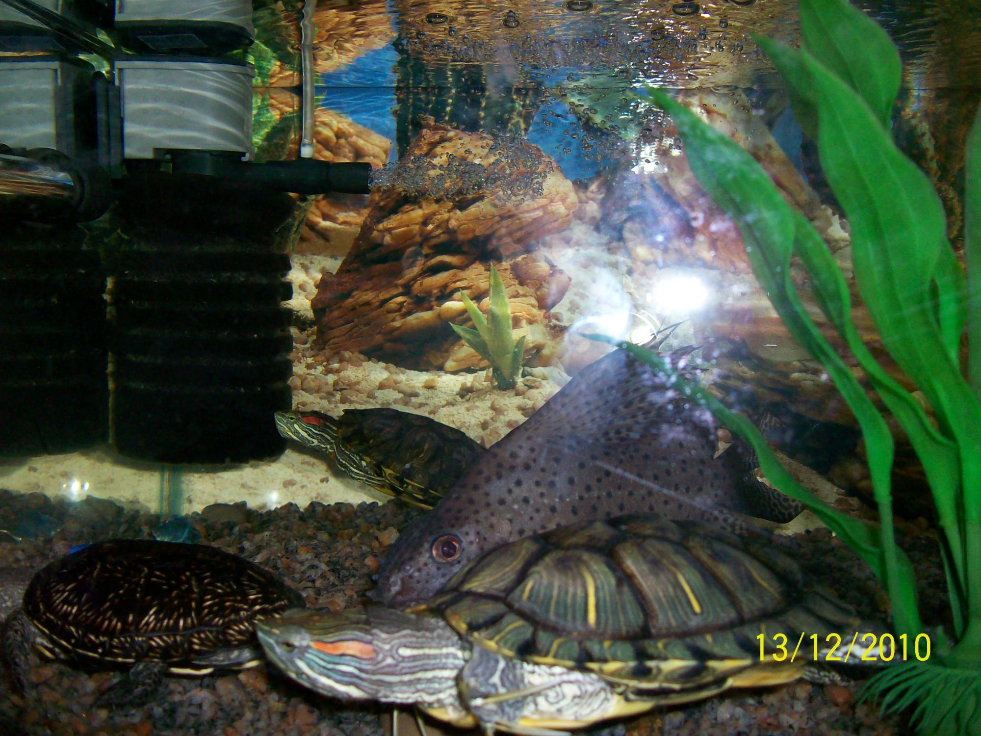 На фото действительно гриб-островок для черепах! Свежие фотки есть, только теперь краб царствует в своем аквасе (было 2, но один трагичестки погиб после линьки), ну а у черепах свое царство с сомом! и островок слепили другой, а то три черепа на одном грибе ну никак!