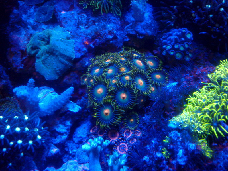 Представляю мой маленький рифчик. Система на 23 литра, чистый объём залитой воды - 17 литров. Фильтрация осуществляется в боковом отсеке через бой ЖК и мешочек Purigen от Seachem. Камни - ЖК. Освещение - только светодиоды. Запитан свет от двух таймеров - сначала включаются синие диоды на модулях "пиранья", потом основное освещение синие/белые осветительные диоды. Луна горит круглосуточно. Животные: желтохвостая хризиптера, офиура, много маленьких офиур и астеринок, пушистые черви полихеты, 2 мирных краба. Много кораллов - разные виды зоантусов, политой, протопалитой, дискосомы, бриариум, клавулярии, синулярии, из LPS - кауластрея, эуфилия, акантастрея и др.