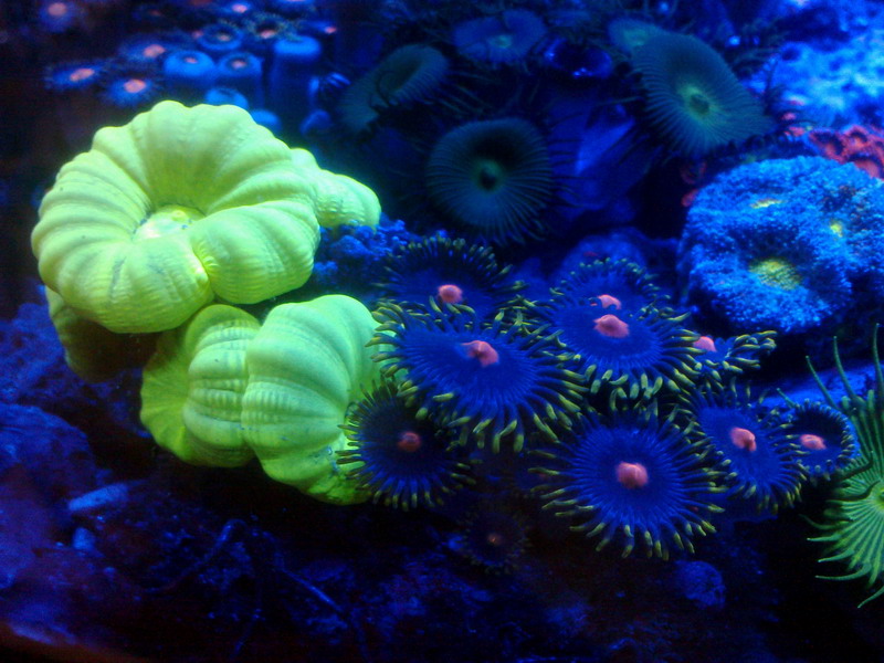 Цветность, как по мне, отличная. Общую динамику роста описать сложно. Например, клавулярия прёт как сорняк с невиданной силой, зоантусы и диски тоже. А вот кауластрея раздувается бешенно, но никак не поделится. Хотя я наблюдаю на полипах по два рта уже.