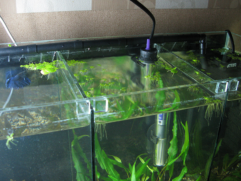 И я сегодня наконец-то сделала задуманное. Перегородки срезала, поставила на камни, таким образом поднялись над грунтом срезанные нижние углы перегородок, что меня радует, ведь здесь каждая щель на вес золота  . Повесила фильтр, открыла аквариумную тумбу и нашла там давно заброшенную флейту. Все-таки мучило меня отсутствие движения воды, теперь отпустило  . Петушки тоже спокойны, не нервничают - течение минимальное. Ну и оставила только криптокорины, а также детки лимнобиума на поверхности, пистия была мне не по душе, какая-то она неопрятная на вид. На последней - без фильтра, конечно, эстетичнее...