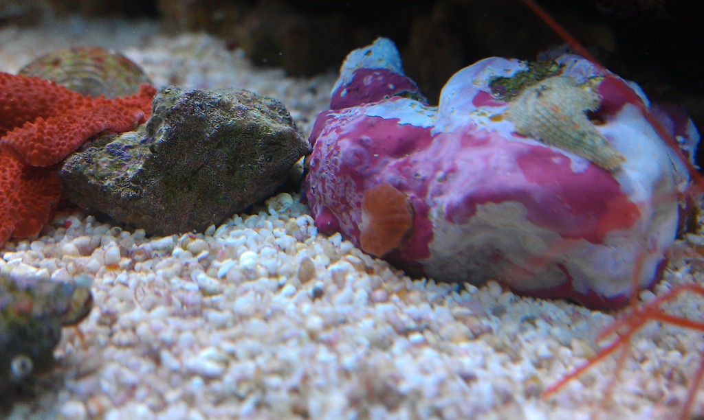 На камушке скелет, обведенный кружочком - бывшая Акропора. Что бы не терять ЖК, я высверлил небольшое углубление примерно 5 мм и приклеил супер гелем новый коралл - Поциллопору. Живет уже примерно 3 месяца.