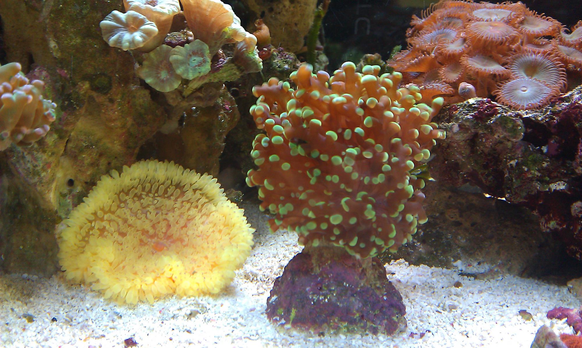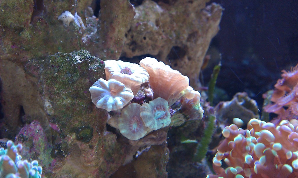 На камушке скелет, обведенный кружочком - бывшая Акропора. Что бы не терять ЖК, я высверлил небольшое углубление примерно 5 мм и приклеил супер гелем новый коралл - Поциллопору. Живет уже примерно 3 месяца.