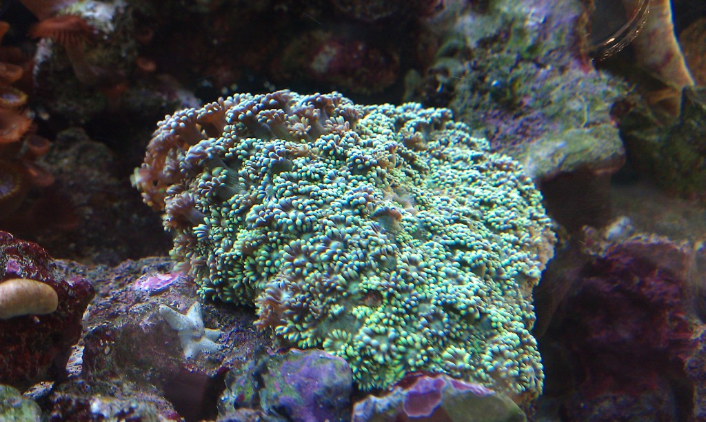 Акрапора-она сейчас белая,и чуток растет-это я засек....на некоторых ветка,в местах "спор-полипов" начала краснеть....Правда некоторые веточки коричневые-изначально были белые...Но сейчас снова белеет.Покраснение началось дня 2-3 назад...