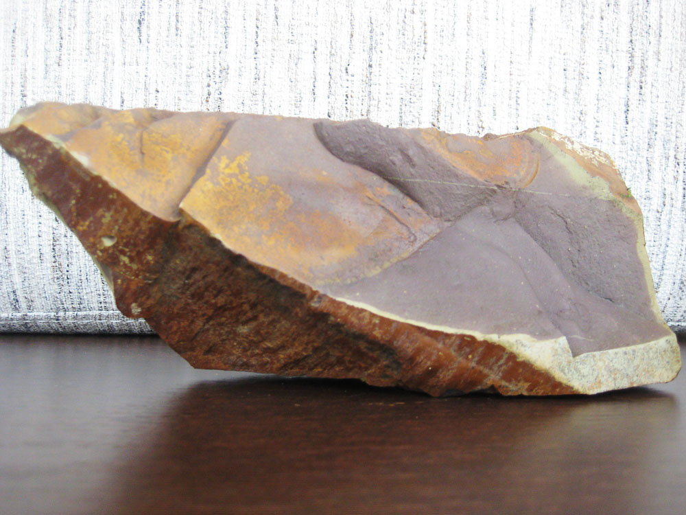 Камень имеет слоистую структуру, тоесть в природе валяються пластинки разной тольщины, легко ломаються руками, имеют фиолетовый оттенок!