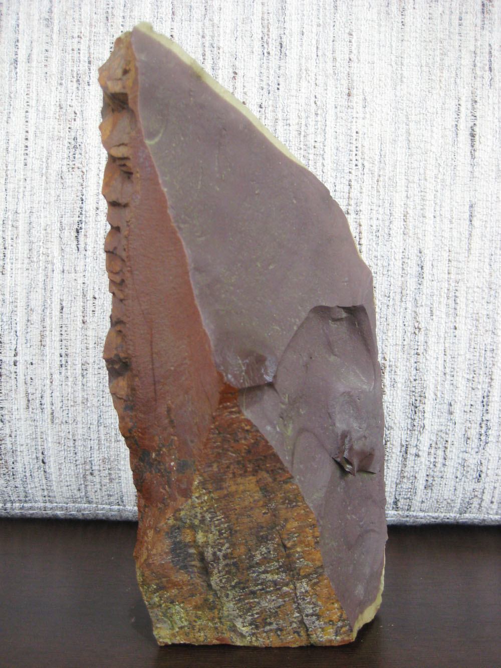 Камень имеет слоистую структуру, тоесть в природе валяються пластинки разной тольщины, легко ломаються руками, имеют фиолетовый оттенок!