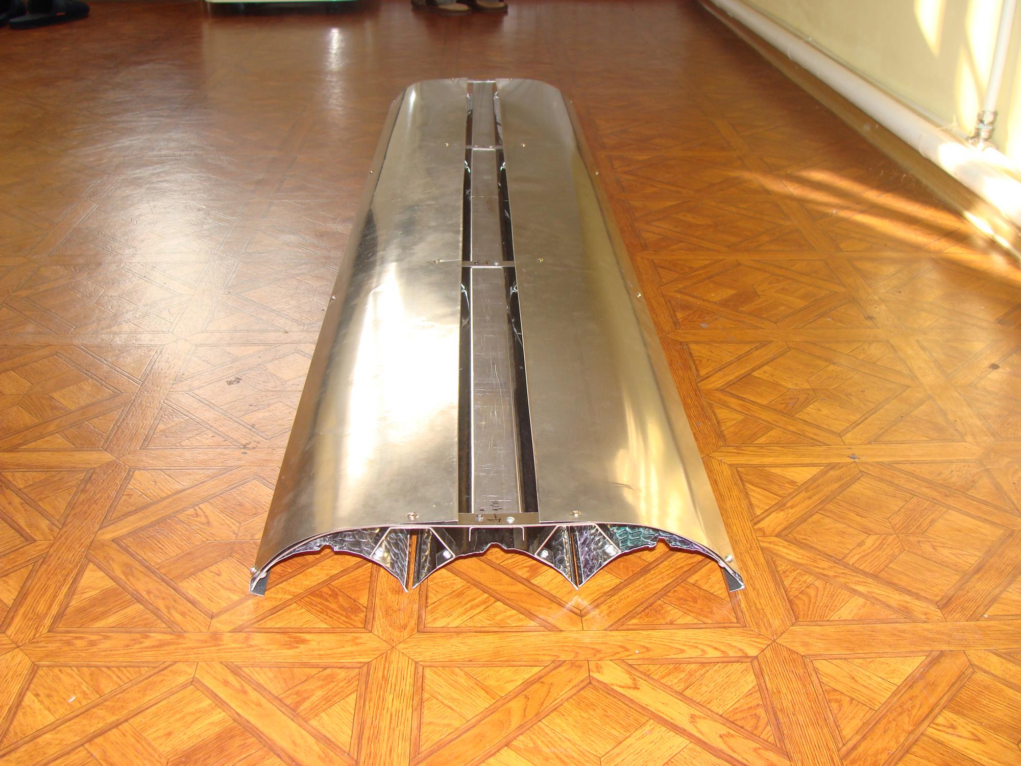 В основе, решено было использовать три отражателя для Т-8, в которые станут по две ЛЛ Т-5. В соответствии с данными требованиями, на хоз. рынках, пунктах приёма металлолома, в знакомых мастерских, были произведены поиски подходящего для изготовления корпуса материала. И вот, на Староконном рынке, в одном из контейнеров, был обнаружен подходящий материал - матовая нержавейка, толщиной 0.3мм. Но вот незадача! Рулон шириной всего 39см., чего явно недостаточно для корпуса. Потеряв на последующих поисках ещё одну неделю и не найдя ничего более подходящего, пришлось остановиться на первом варианте.