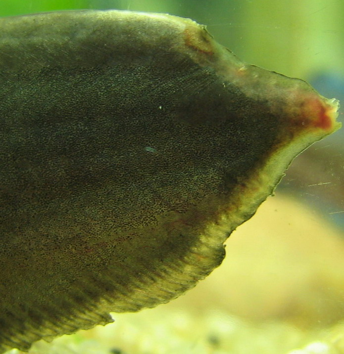 Еще через день начал активно разлагаться хвост, причем не только плавник, но и примерно 1см. мышечной ткани с края хвоста. От остальных плавников остались только лучи.