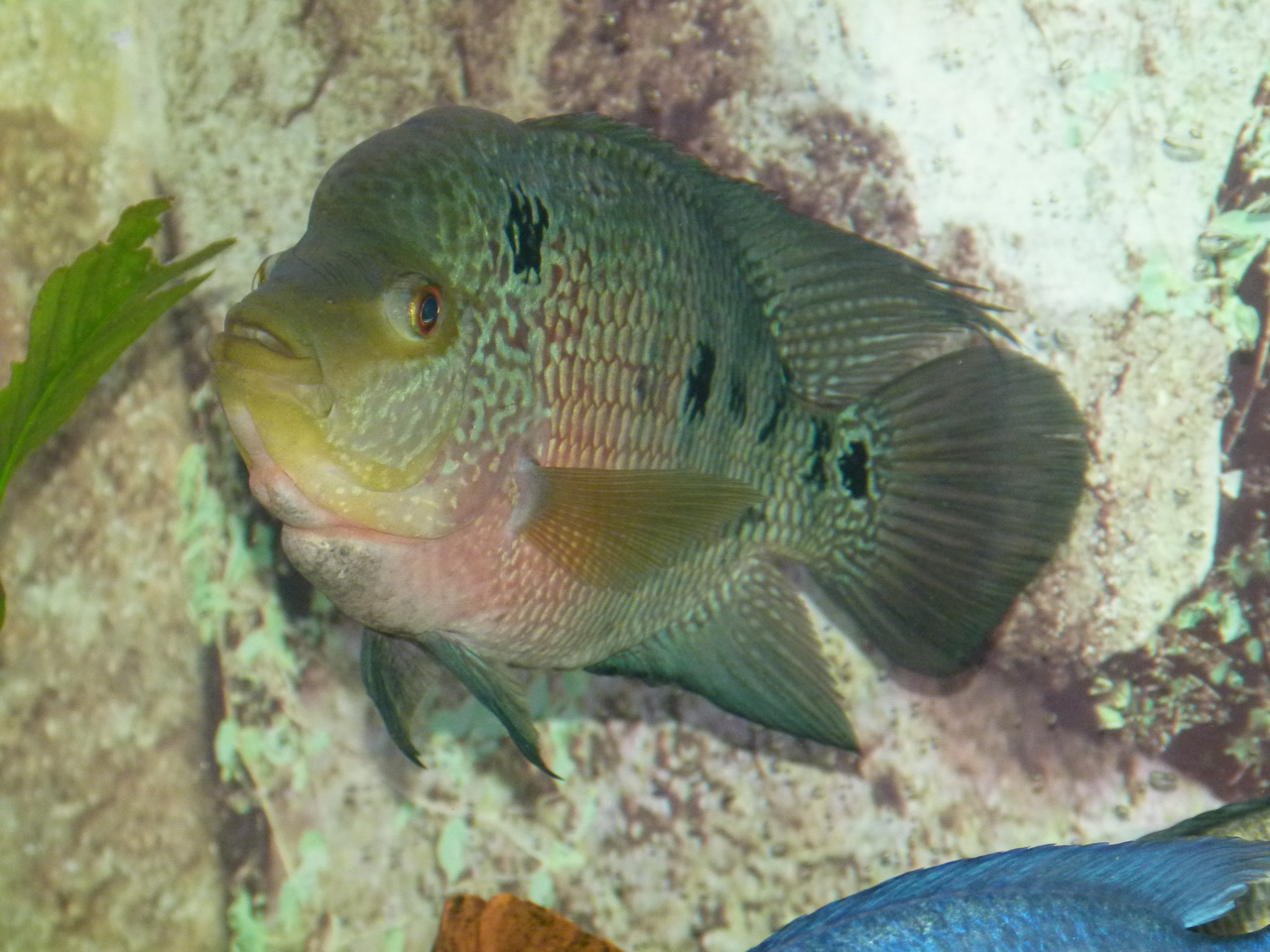 самец бирюзовой акары не дает ему расслабиться, постоянно у хорна где-нибудь да чешуя сбита...