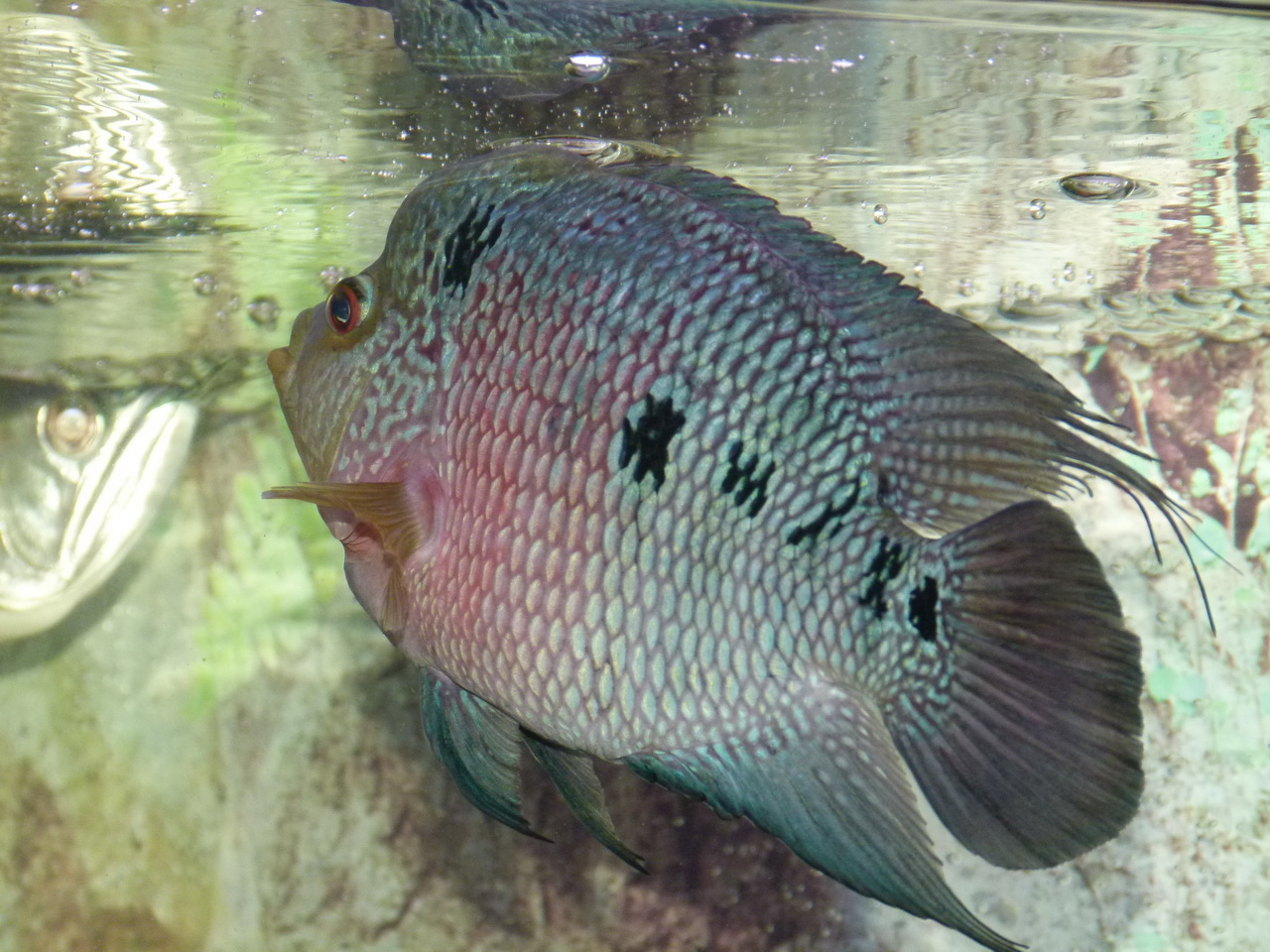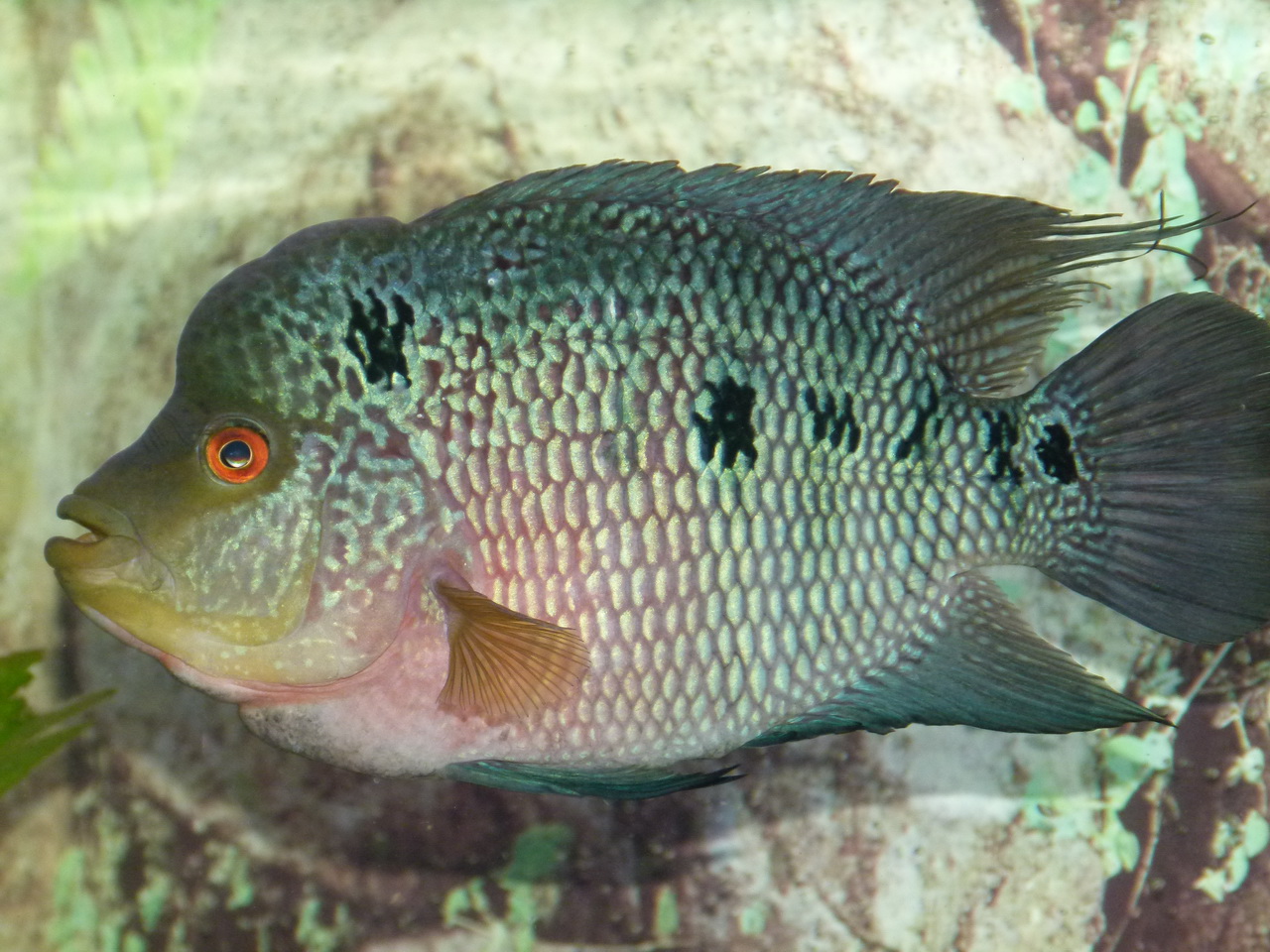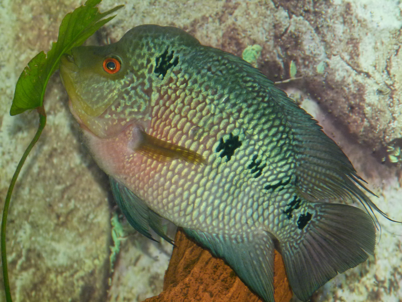 самец бирюзовой акары не дает ему расслабиться, постоянно у хорна где-нибудь да чешуя сбита...