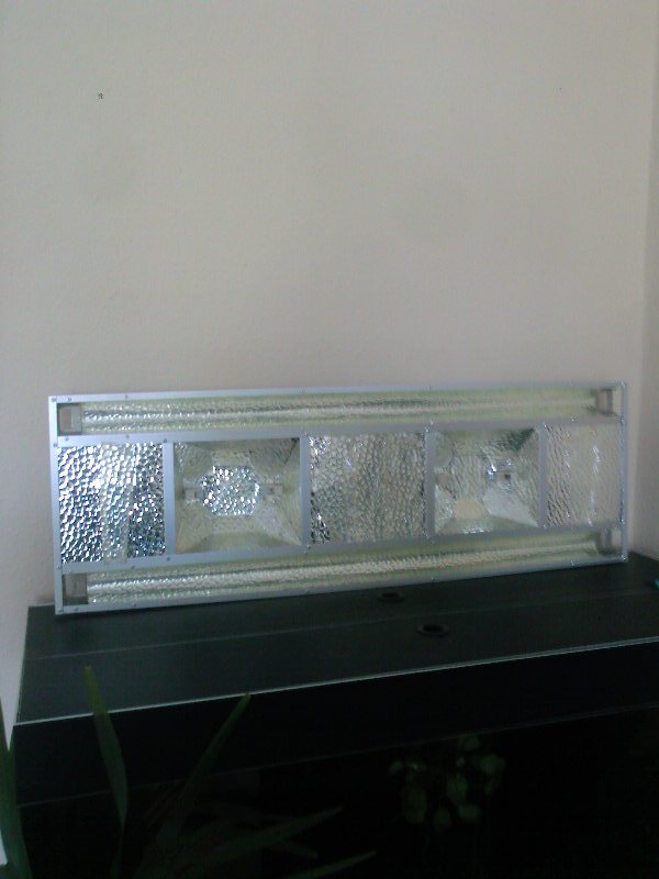 Новому светильнику уже год  - полет нормальный, вот только опять же - нет времени дооформить (кожух светильника все еще пылится на балконе  ). Сделан полностью из алюминия, 2 по 39 Т5 8000К Сильвания (Дух, большое спасибо - лампы очень удачные), 2 по 70 МГ 5200-5800К Сильвания, ПРА импульсная на 70 Вт - 2 шт и баласт на Т5 - все VS.