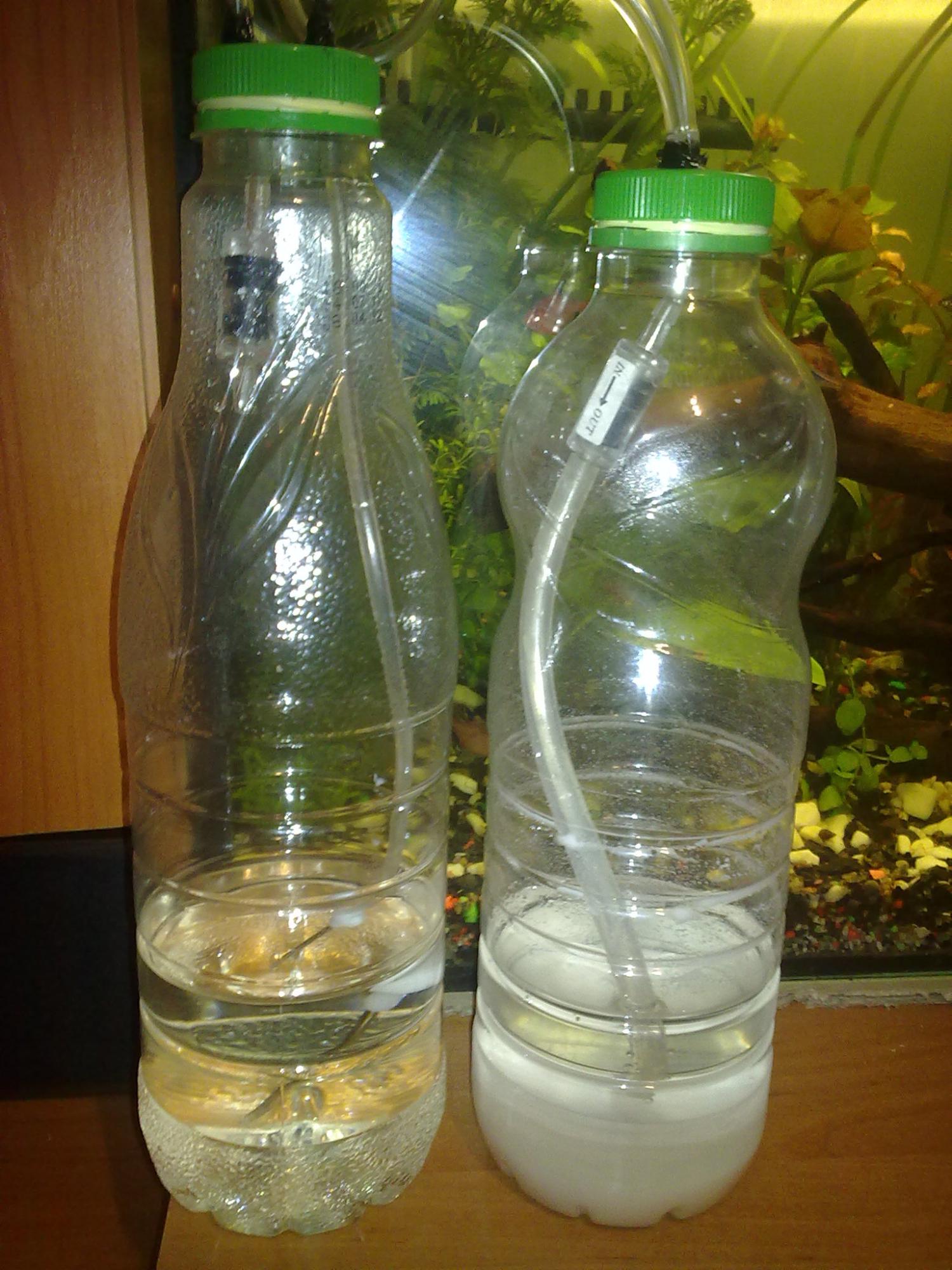 Запуск, он производится очень просто, перекрываем кран подачи СО2 в аквариум и сдавливаем рукой бутылку с кислотой, выдавив немного ее в соду, реакция начинается мгновенно и давление в обеих бутылках резко увеличивается (1-2,5 атмосферы).