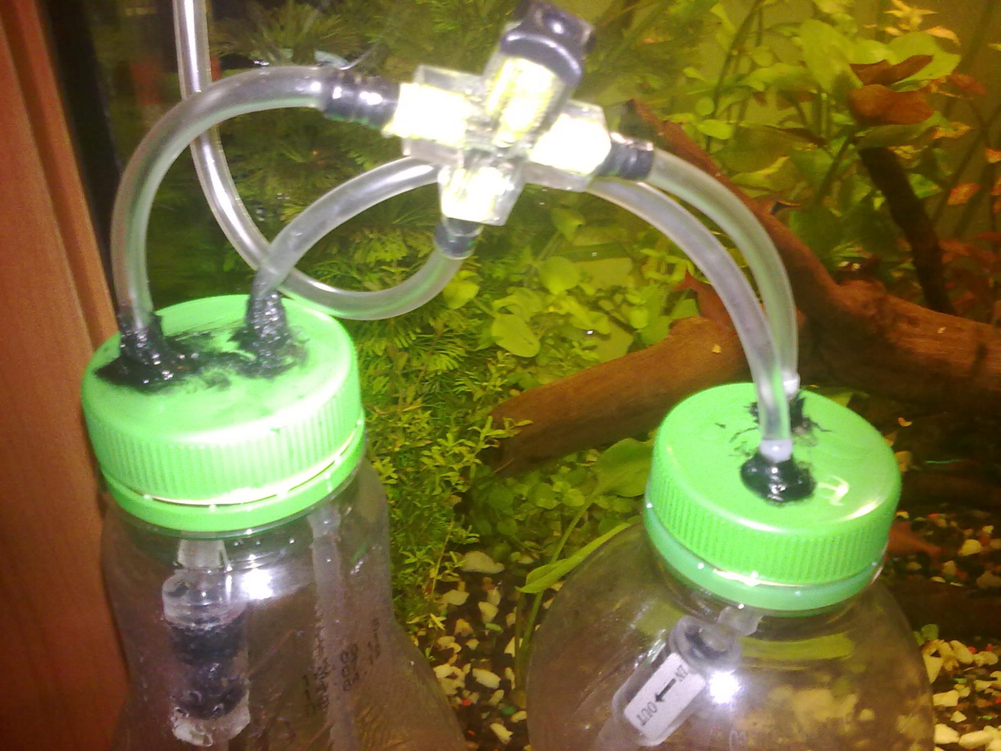 Закрываем бутылки заранее подготовленными пробками со штуцерами и разводкой, подключаем к аквариуму (к реактору, флейте, и т.д……)