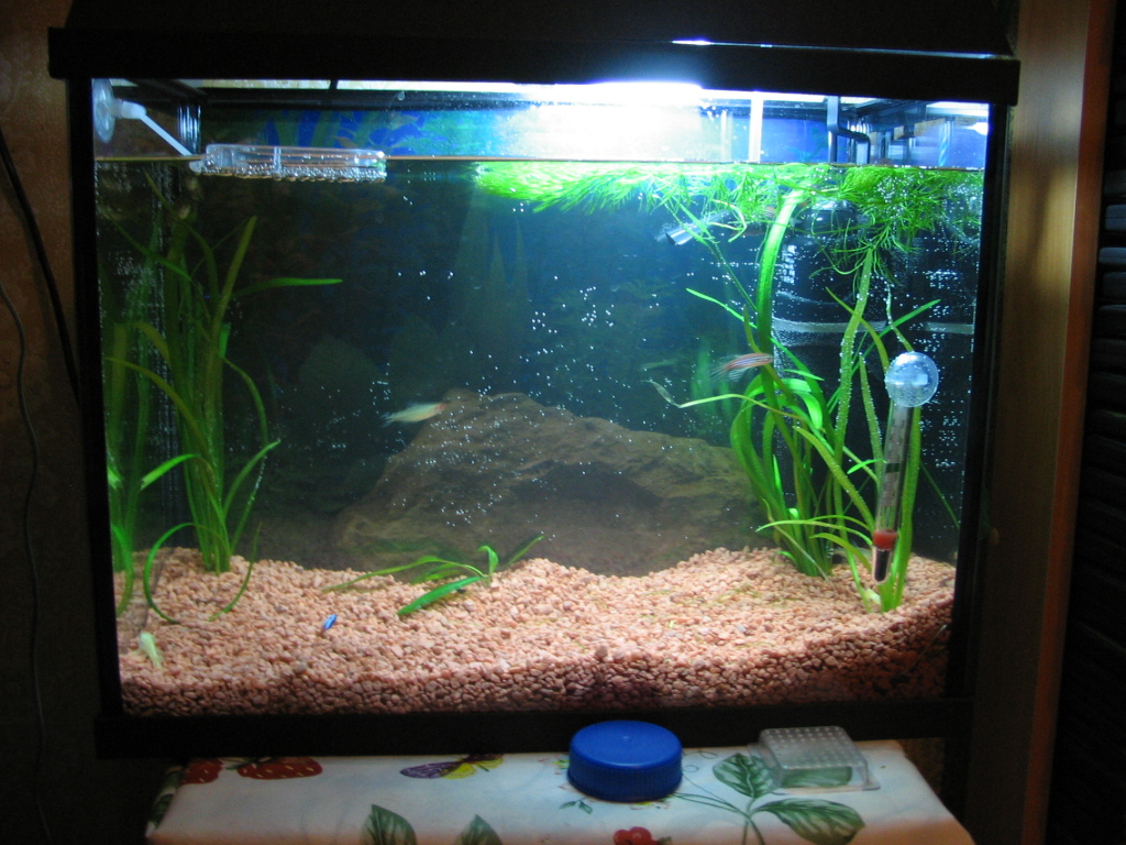 единственное, ИМХО, добавила бы кустик валиснерии перед фильтром, терморегулятор убрала бы на задний план - по-дальше, термометр перевесила бы на торец - поглубже, подальше, чтоб в глаза не бросался, а кормушку (повторюсь - ИМХО) убрала бы совсем (я кормлю по поверхности, тем более, что она у Вас, как и у меня, не очень велика).