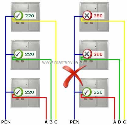 Откуда появляется 380? Тут все просто, хоть на самом деле это условность. Одна фаза, через нагрузку, по участку цепи, который до аварии был нолем, встречается с другой – так получается и повышенное, а где то, и пониженное напряжение, например в том случае, когда через розетки получаются последовательно подключены электрочайник и телевизор, первый будет изо всех сил стараться закипеть, а вот для второго, пониженное напряжение может оказаться фатальным.