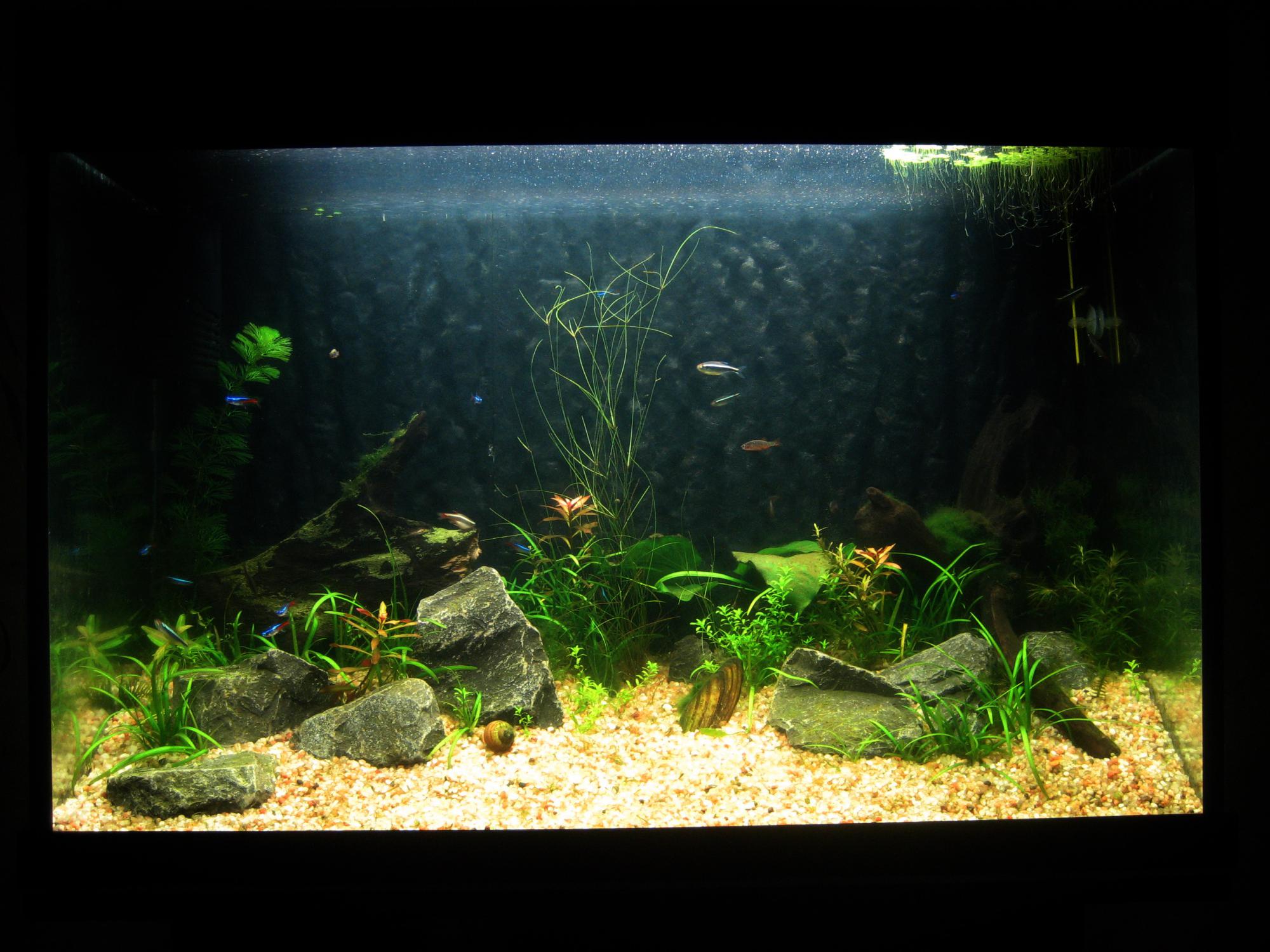 110л., Запущен начало 2010г., растения в начальной стадии роста, Sylvania Gro-Lux F15W, Sylvania Aquastar F15W, обогреватель-Aquael AQ 150, фильтр-Aquael FAN 2 Plus, освещение 10 часов, Неоны (Paracheirodon axelrodi) - 11шт, Попугаи (Pelvicachromis pulcher) - пара, Сомики крапчатые (Corydoras paleatus) - 3шт, Макропод (Macropodus opercularis) - пара, Меченосец (Poeciliidae) - пара, подмена воды раз в два дня 10л.