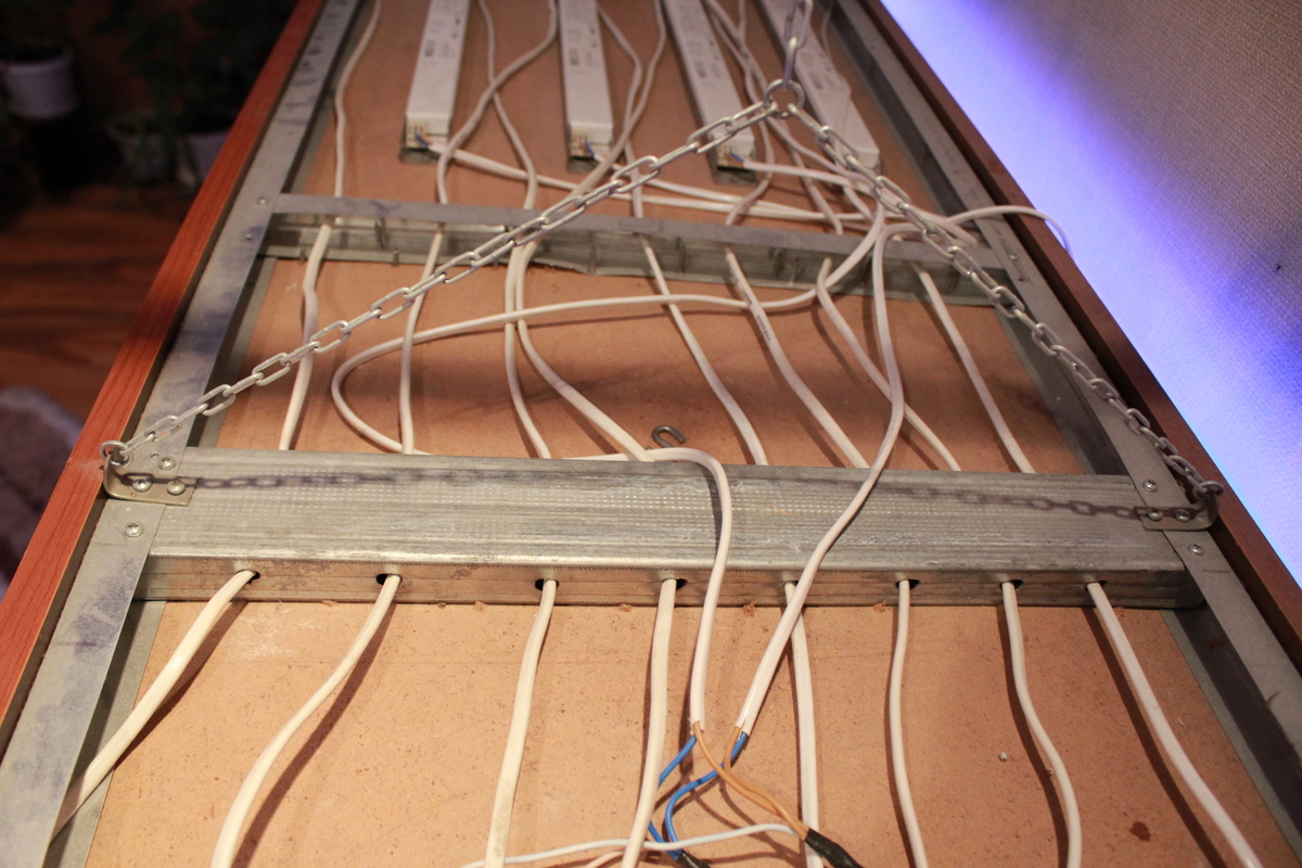 Светильник был сделан очень просто и банально.Из начало взял профиля UD и CD скрутил с них каркас, прикрутил лист ДВП и заламинировал его чтобы не впитывал влагу.Под заказ выгнули мне с оцинковке форму отражателей.Дома их заламинировал алюминиевой самоклейкой. Отражатели прикрутил к каркасу и все это обшил ДСП.